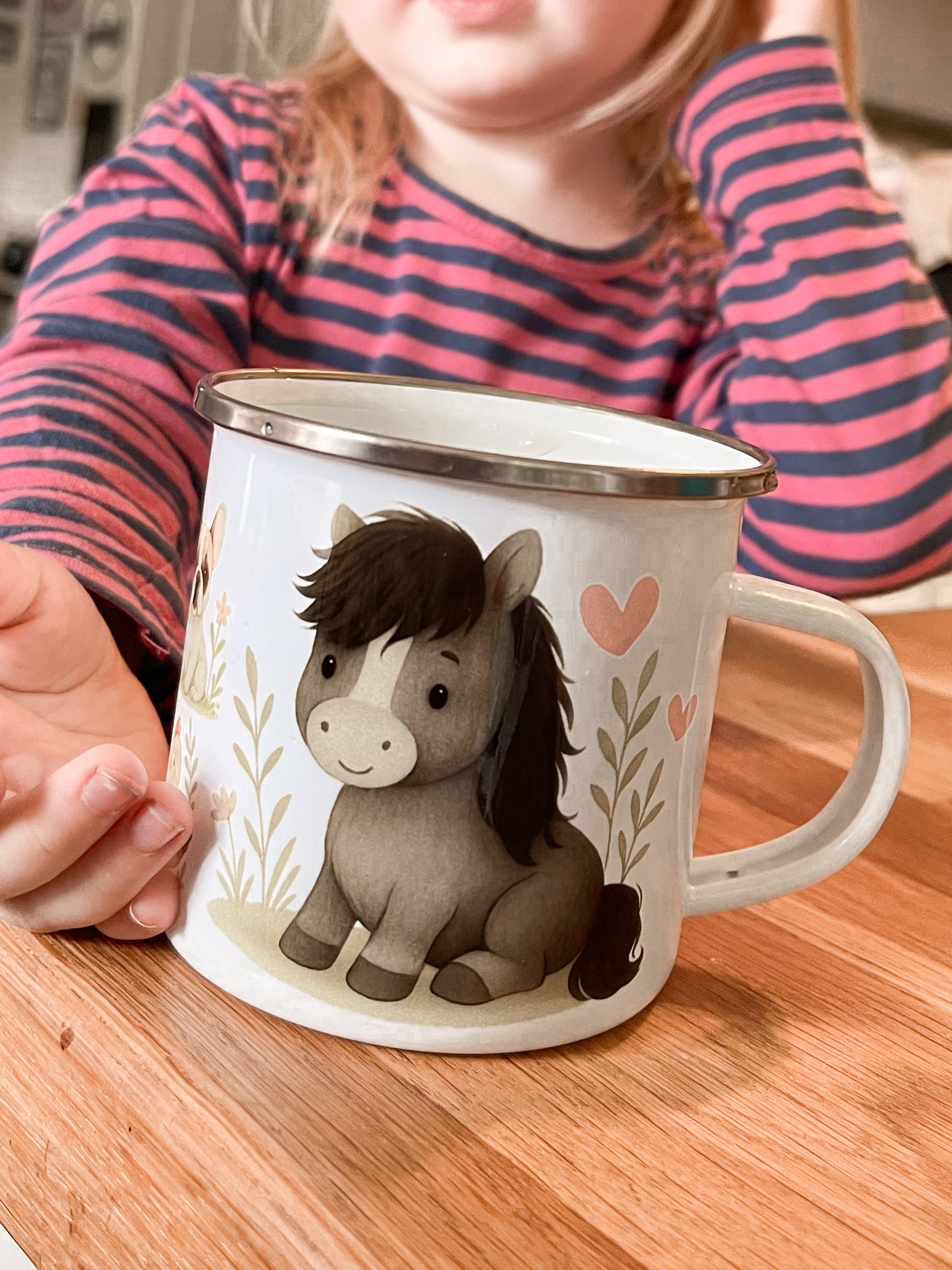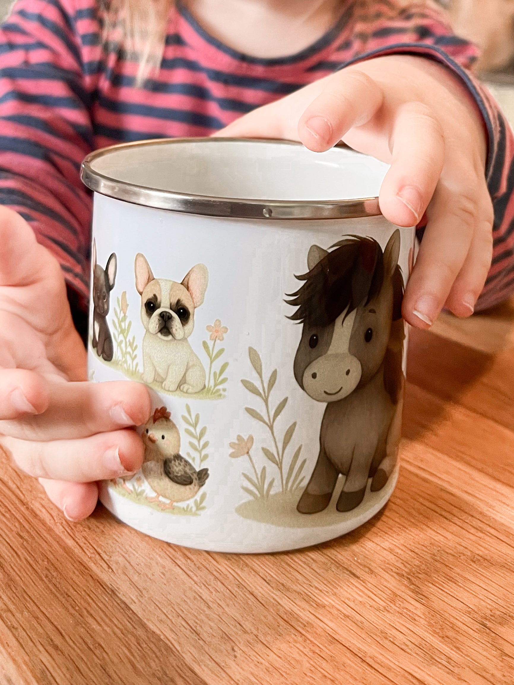 Personalisierte Emaille-Tasse mit bezauberndem Design. Hier wird eine niedliche Aquarell-Version deines Haustieres bzw. deiner Haustiere nach Fotovorlage auf die Tasse gedruckt. Schenke deinem Kind eine einzigartige Emaille Tasse - der perfekte treue Begleiter für alle Abenteuer des Alltags!