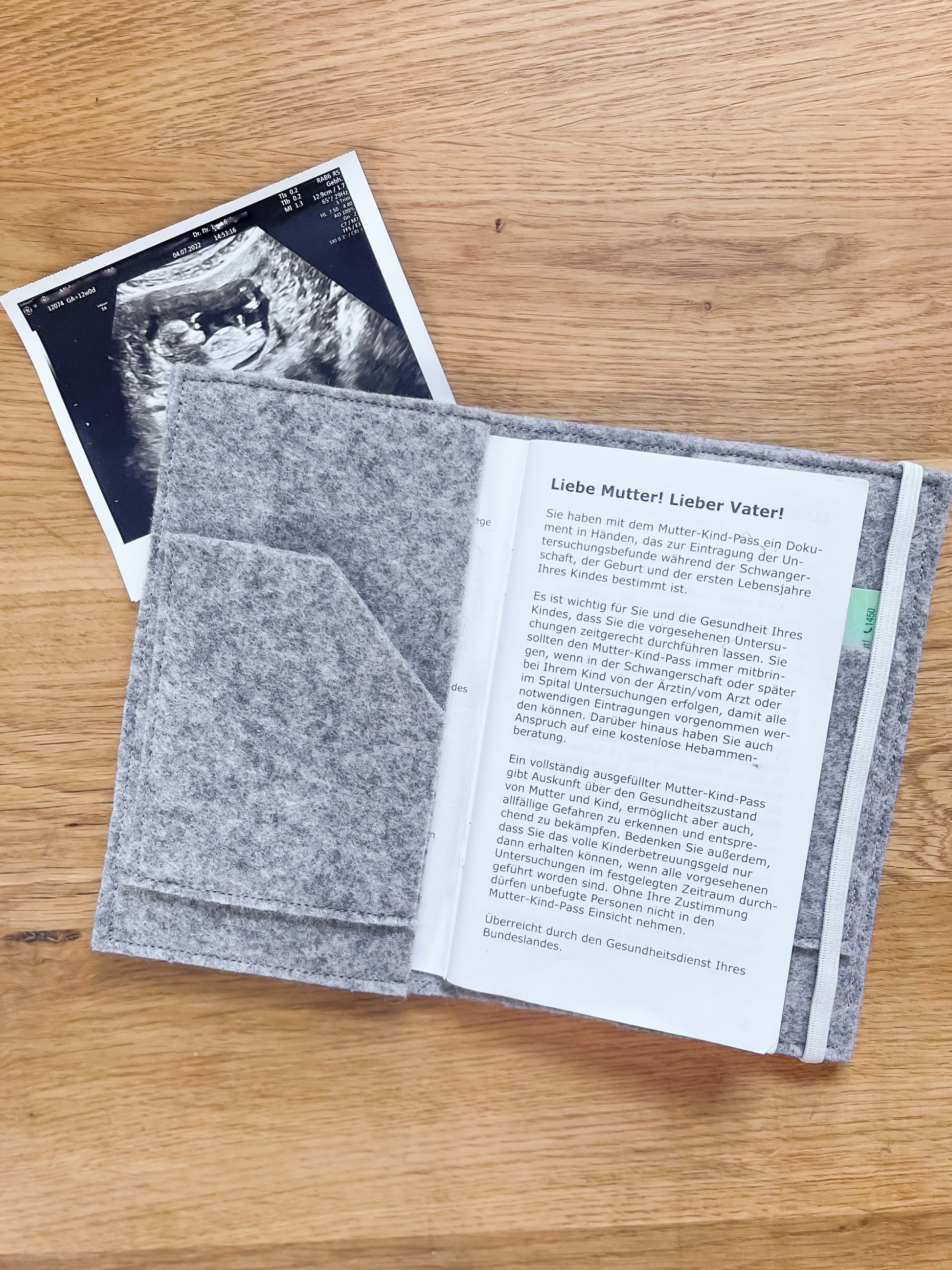 Im Innenteil bietet sie Platz für Ultraschallbilder sowie einem extra Fach für die e-card. Ein Gummiband hält die Hülle praktisch zusammen.