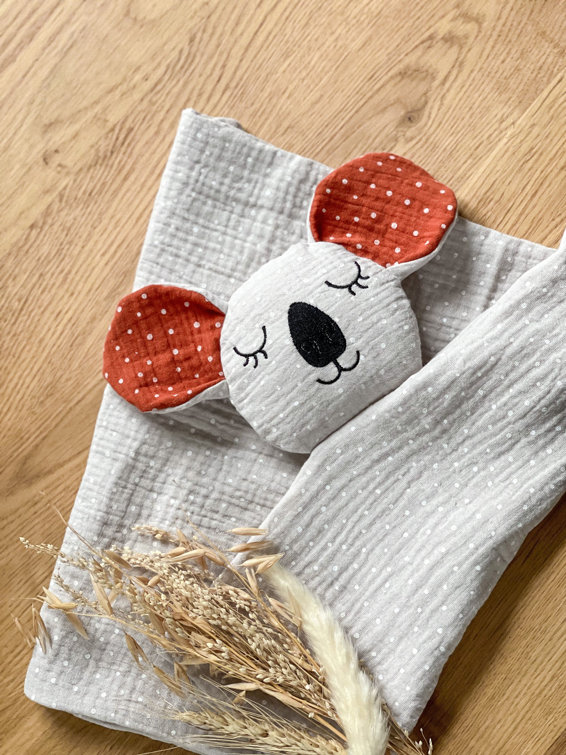 Das Tuch besteht aus extra weichem Musselin (100% Baumwolle).