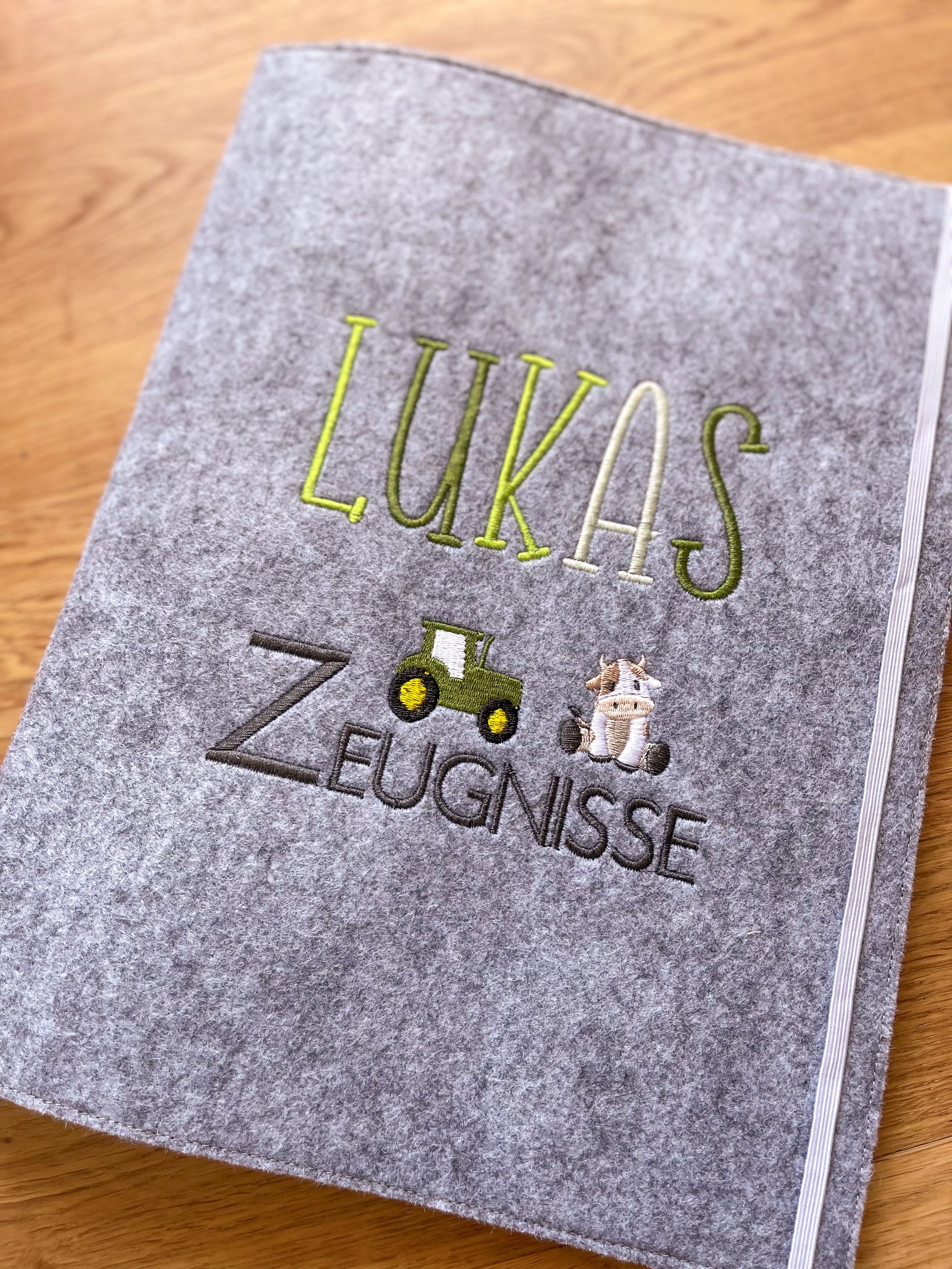 Handgefertigte Zeugnismappen aus hochwertigem Textilfilz mit Personalisierung.